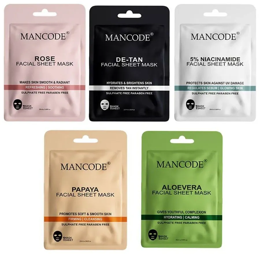 articleHeading: Buy Mancode Papaya Facial Sheet Mask 25ml Promotes Soft and Smooth Skin Firming Cleansing Pore Reducing Brightening and Enhances Daily Glow Korean Sheet Mask for Men Women Sheet Mask Set Combo Pack of 5 Online at Low Prices in India - Amazon.in