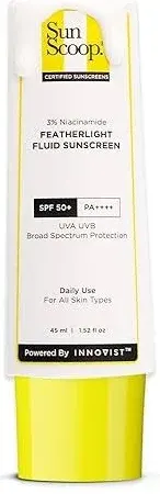 articleHeading: SunScoop 3% Niacinamide Fluid Sunscreen SPF 50+ PA++++ | Super Light Formula | Prevents Tanning & Sunburn | Reduces Pigmentation | Non-comedogenic | 45ml