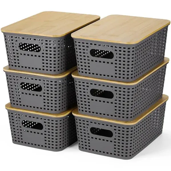 items 1: articleHeading: AOIBOX Plastic Storage Baskets with Bamboo Lid, Stackable Organizer Bins for Shelves, Drawers, Closet, Office - 6 Pack