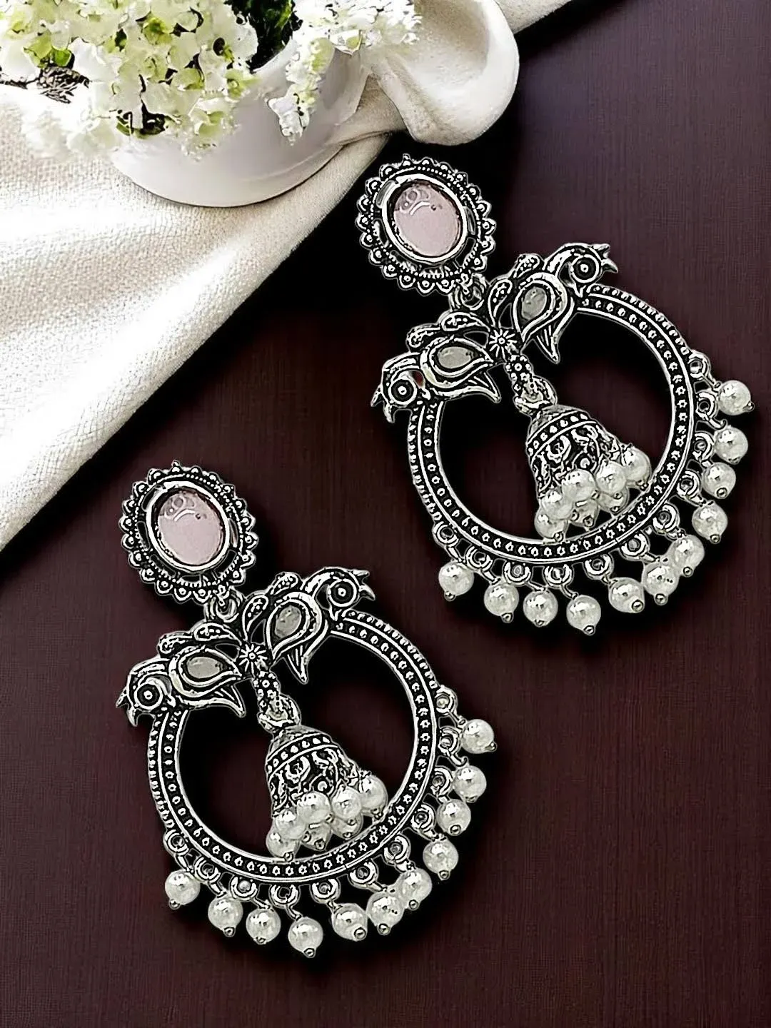 items: items 1: content: These earrings feature an oxidized silver finish that provides a rich, antique look, making them versatile enough to complement both bright and subtle ethnic outfits. The intricate peacock design, symbolizing grace and beauty, is enhanced by sparkling stone embellishments and delicate round plastic pearls at the bottom, creating a refined and elegant appearance perfect for special occasions like weddings and festivals.