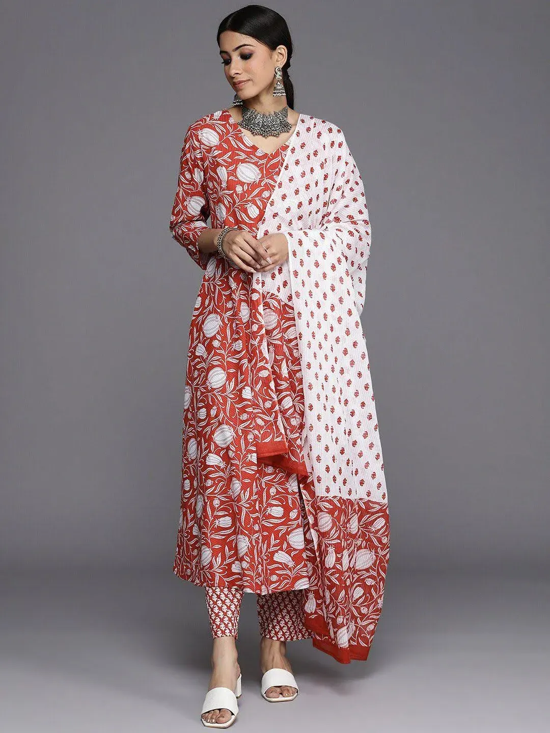 KALINI Floral Printed Pure Cotton Anarkali Kurta with Trousers & Dupatta Set (XL) by Myntra