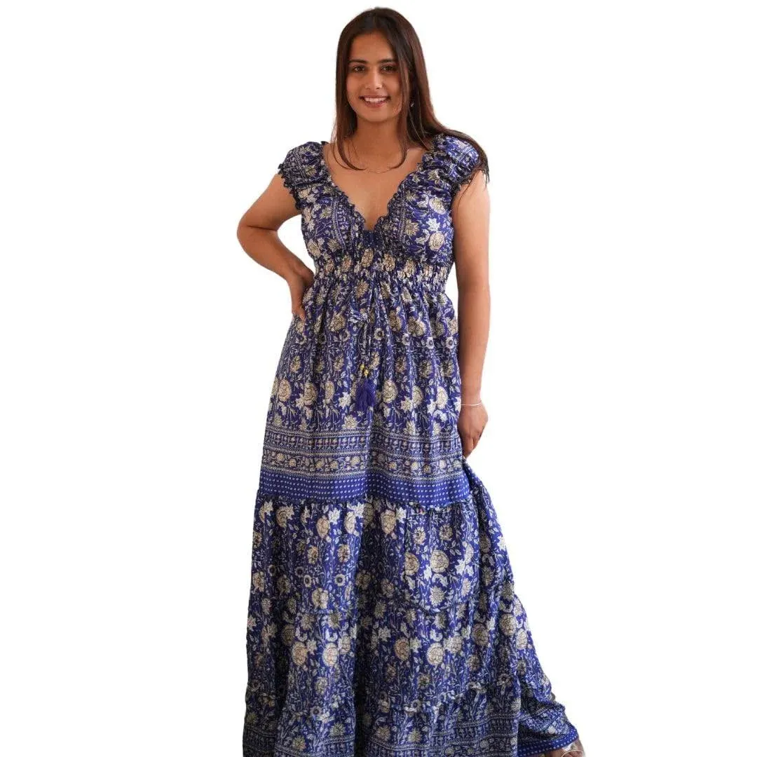 snippets: The JUNGLEE BILLE Boho Bloom Indigo Maxi Dress is a stunning piece of handcrafted fashion..., ...crafted from luxurious silk and adorned with intricate floral block prints.