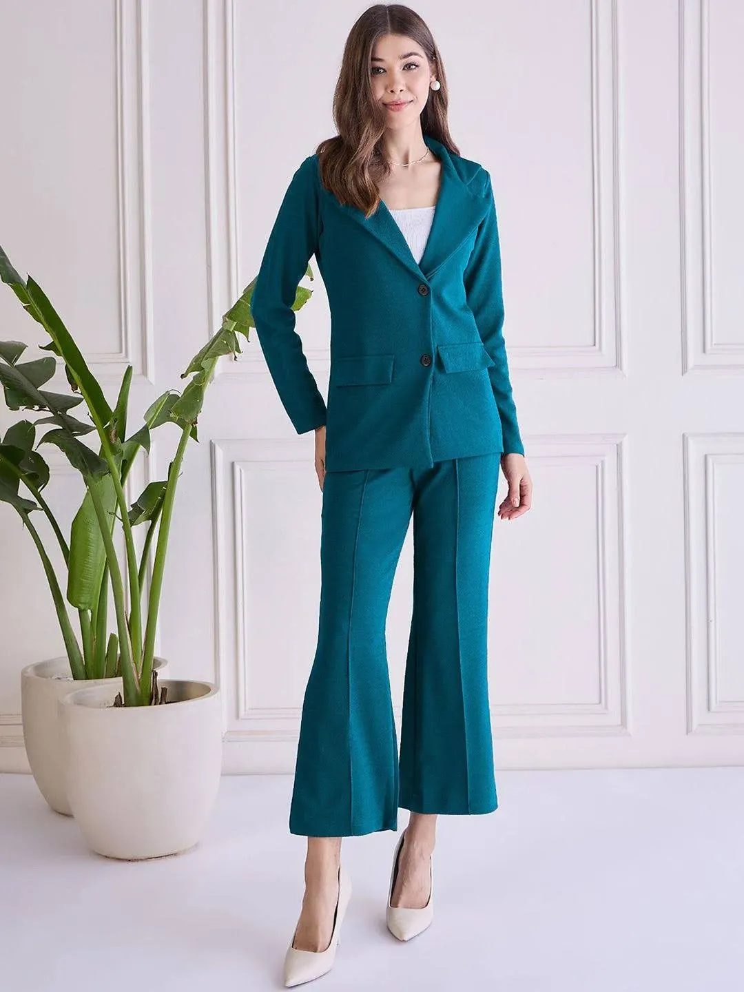 items: items 1: content: This co-ord set, featuring a teal blue blazer and matching trousers, offers a stylish and cohesive outfit suitable for casual occasions. The blazer has a classic lapel collar and long sleeves, while the trousers are designed for ease with a slip-on closure and elasticated waistband.