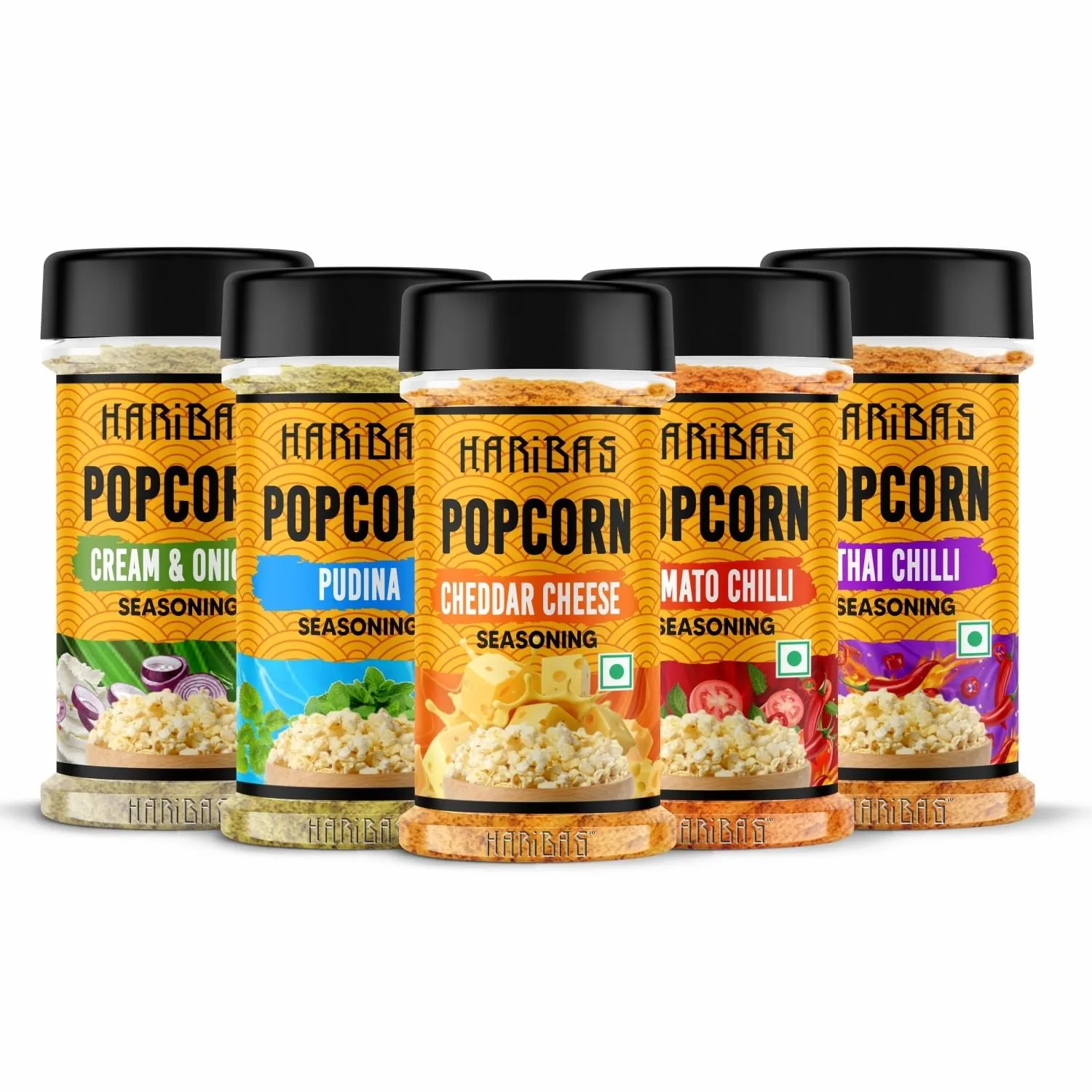 detailedSources: items: items 1: articleHeading: HARIBAS Combo Pack Of 5 Pop Corn Seasoning Powder | Tasty Powder 50 G Each Sprinkle On Maggie/French Fries | Cheddar Cheese Cream Butter & Onion Tomato Chilli Thai Pudina For Popcorn Nacho