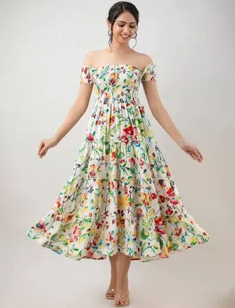 items 4: content: The Aawari Women Floral Off-Shoulder Midi Dress is noted for its versatility, being suitable for both dressing up for events and keeping it casual for outings like brunch. This adaptability makes it a practical addition to a wardrobe for various social settings.