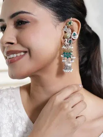 title: Rubans Gold & Silver Plated Peacock & Floral Ear Cuff Earring With Green & Pearl Brass Jhumki Earring