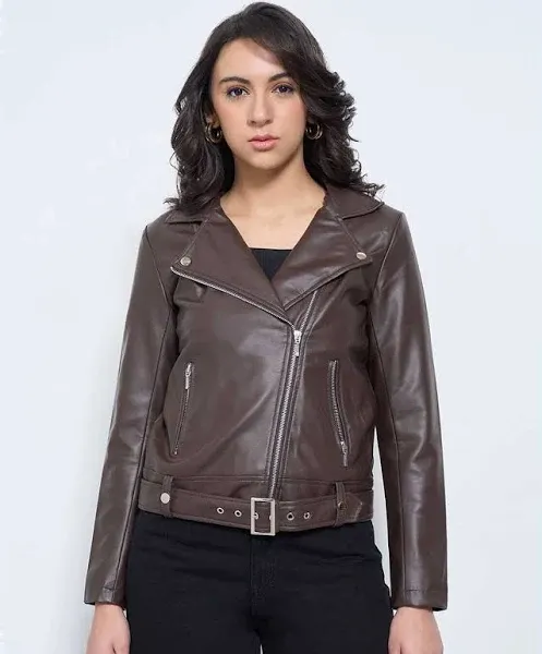 title: SF Jeans by Pantaloons Women Regular Fit Zip-Front Bikers Jacket For Women (Coffee, XS)