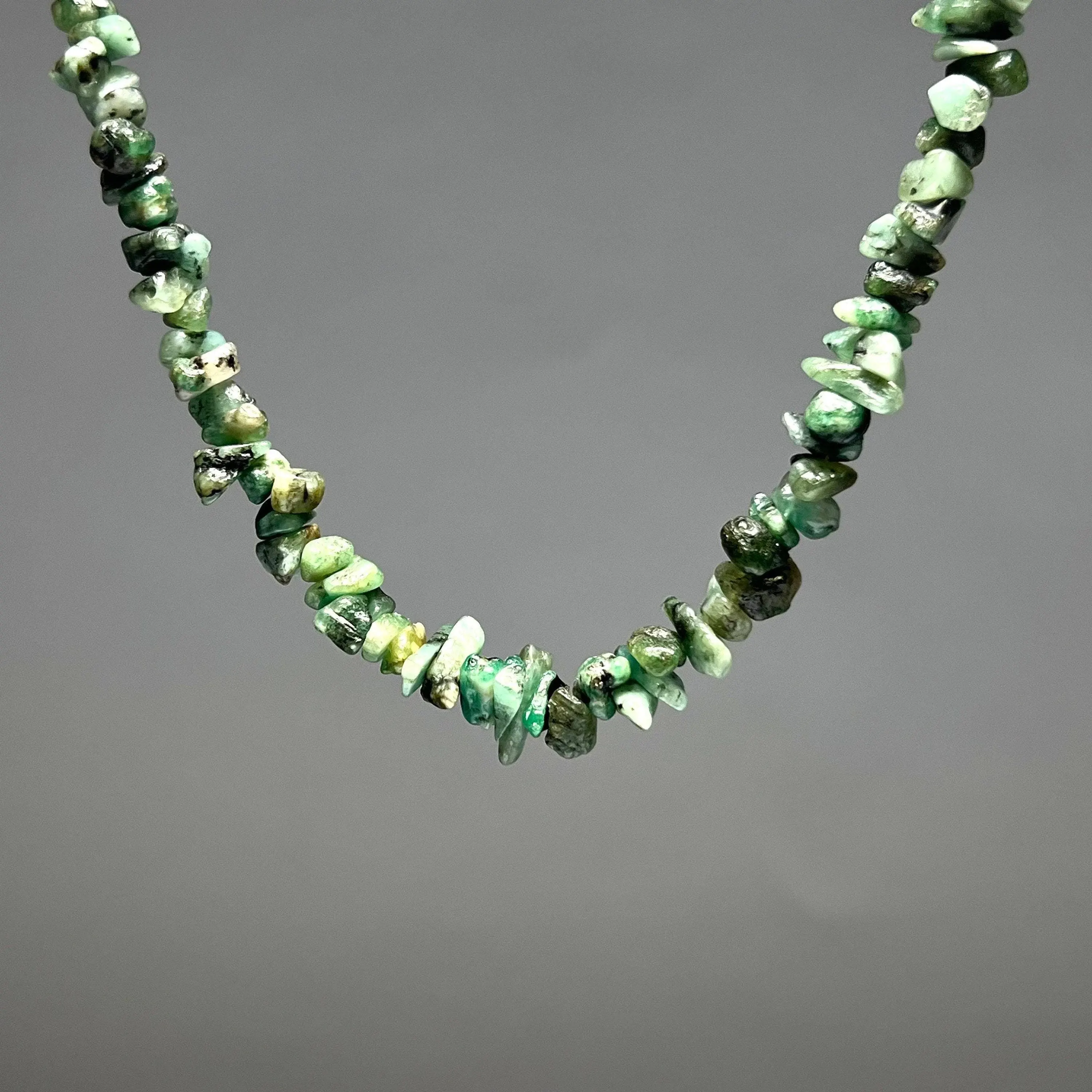 items: items 1: content: The necklace is appreciated for its beautiful, rich tones and the positive 'vibes' it's said to bring, aligning with a boho and hippie style. Users find the long gemstone chip design appealing, especially for those who haven't owned an emerald version before.