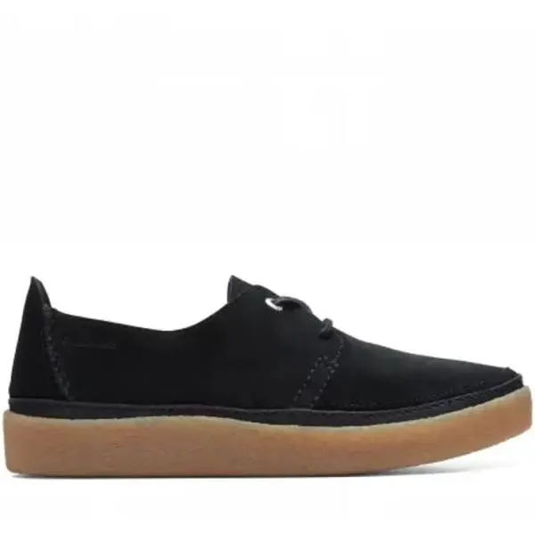 snippets: This shoe features an unlined, deconstructed black suede upper, providing a sleek and minimalist aesthetic., The iconic crepe-textured rubber cupsole not only enhances the shoe's visual appeal but also offers durability and traction.
