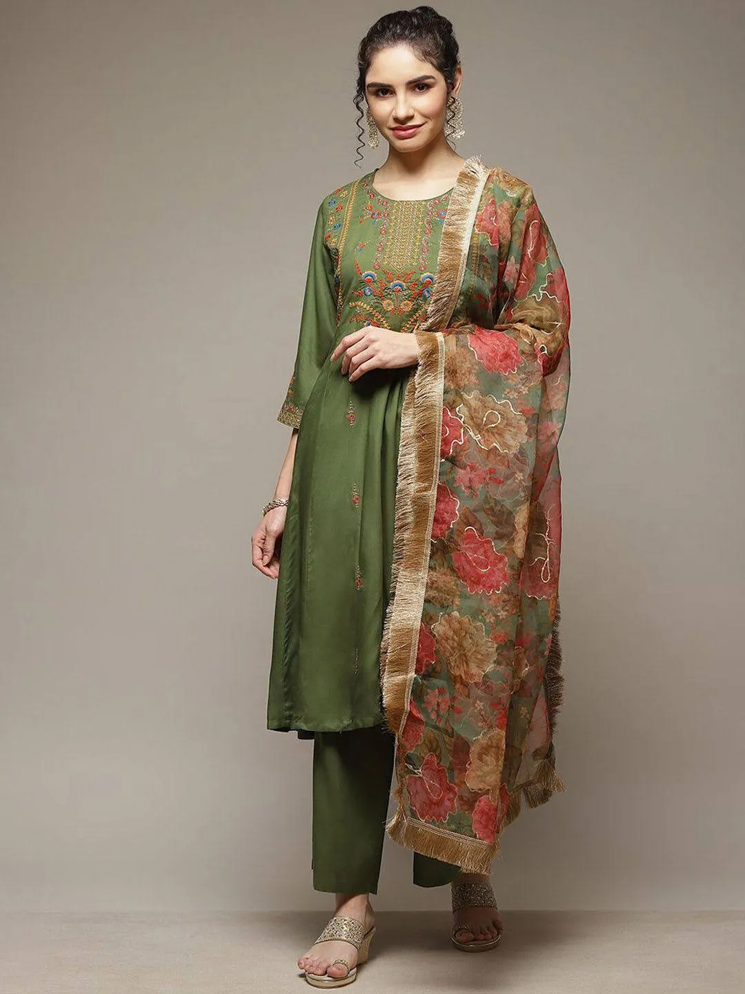 snippets: The Rangriti Floral Embroidered Round Neck Panelled A-Line Kurta with Palazzos & Dupatta is a stylish and comfortable choice for those seeking traditional attire with a modern touch., The A-line design ensures a comfortable fit, allowing ease of movement., Rangriti products are often considered affordable without compromising on style.