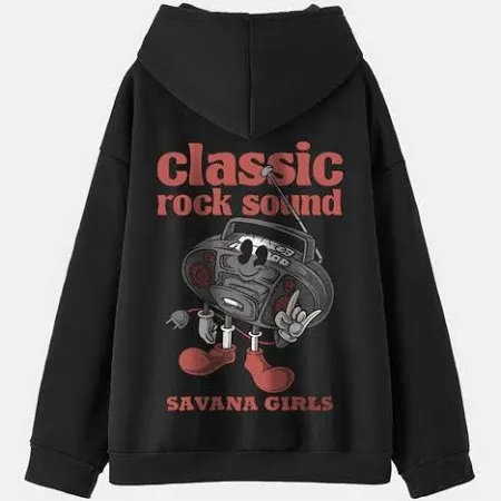 title: Savana black printed pullover sweatshirt (m), hooded, dropped shoulder sleeve,
