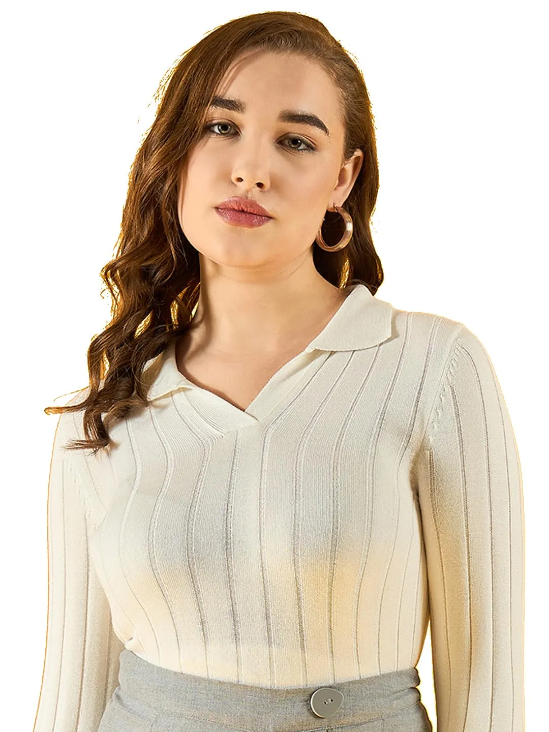 title: 98 Degree North Women Cotton Self Design Collar Neck Pullover Has A Full Sleeves and Straight Hem-RG1154-WHITE