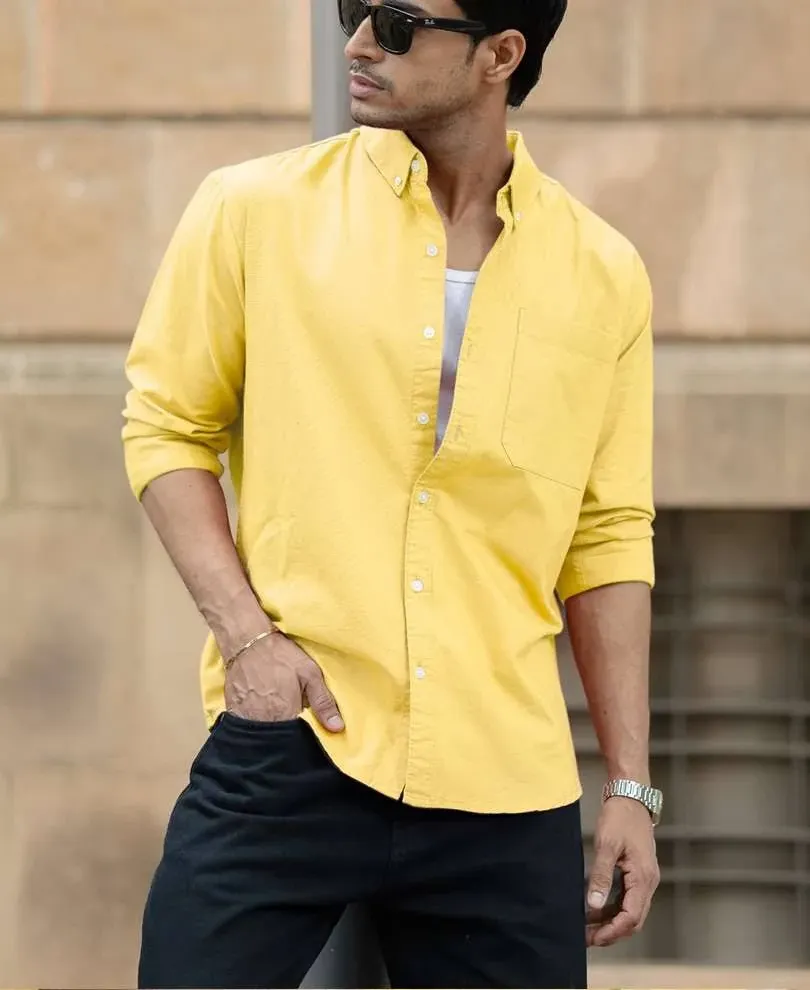 name: Powerlook Men's Regular Fit Yellow Cotton Oxford Full Sleeves Shirt