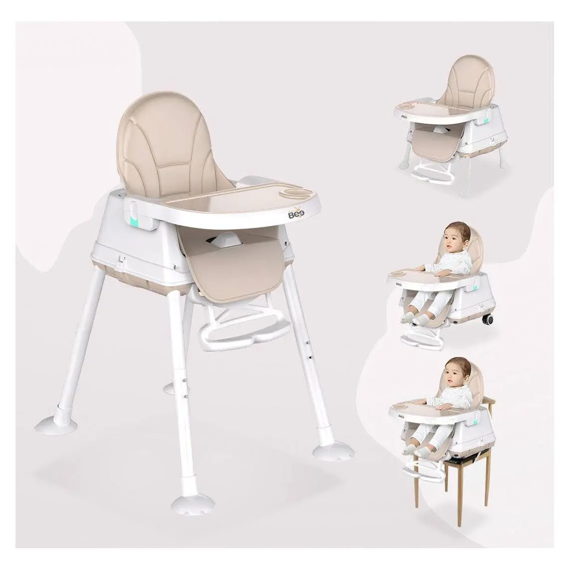 snippets: The Golden Bee Convertible High Chair is designed for babies and toddlers, offering multiple configurations including a high chair, booster seat, toddler chair, and play table., It can be used as a high chair, booster seat, toddler chair, or play table