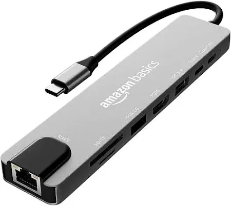 items 2: articleHeading: Amazon Basics USB-C Hub Dock 7-in-1 with 4K 30HZ HDCP Compliant, Aluminium Type C Adapter with 4K HDMI Port, USB 3.0 Port, USB-C Power Delivery, TF/SD Card Reader, Mac and Windows USB-C Devices