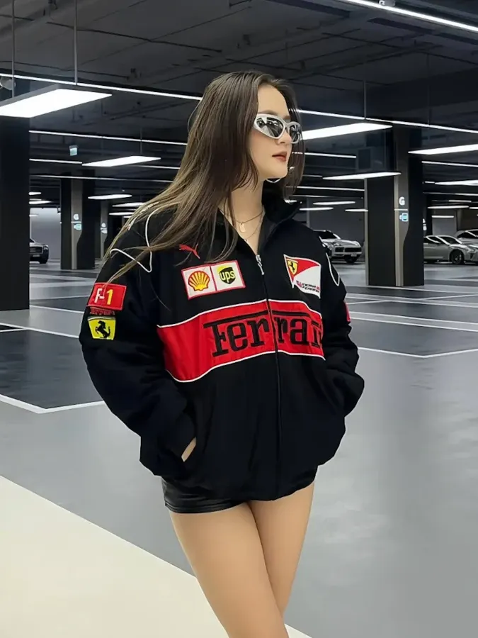 snippets: In summary, the Racing Icon Black Ferrari F1 Vintage Jacket by Drip Mania combines style, comfort, and durability, making it a compelling choice for Ferrari enthusiasts and fashion-forward individuals alike.