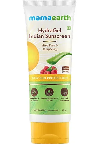 title: Mamaearth HydraGel Indian Sunscreen SPF 50 With Aloe Vera & Raspberry For Sun Protection, 50 g
