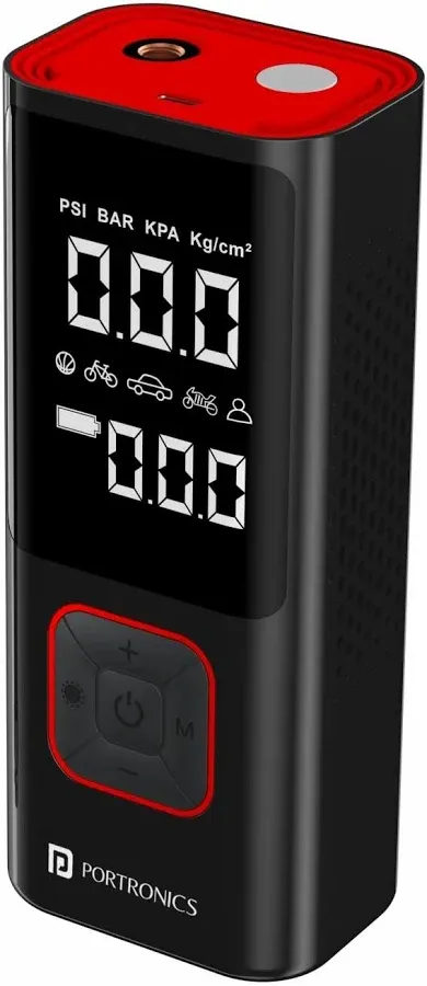 title: Portronics Vayu 2.0 Rechargeable Tyre Inflator with 150 PSI Pressure, 6000 mAh Battery, Preset Modes, Digital Display, Flashlight Torch, Air Pump