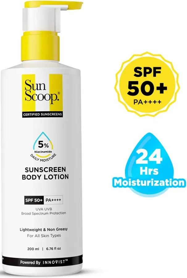 detailedReviews 5: content: I’ve been using this SunScoop sunscreen body lotion daily and it’s honestly one of the best I’ve tried. It’s lightweight, non-greasy, and absorbs quickly without any stickiness. The SPF 50+ and PA++++ offer strong protection, and the 5% niacinamide leaves my skin feeling soft and nourished.