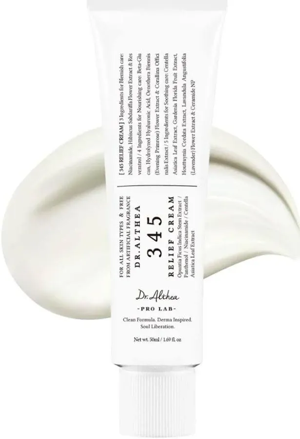 snippets: Dr. Althea 345 Relief Cream offers a formulation aimed at soothing and hydrating sensitive and acne-prone skin., Its blend of active ingredients addresses multiple skin concerns, including irritation, redness, and uneven tone.