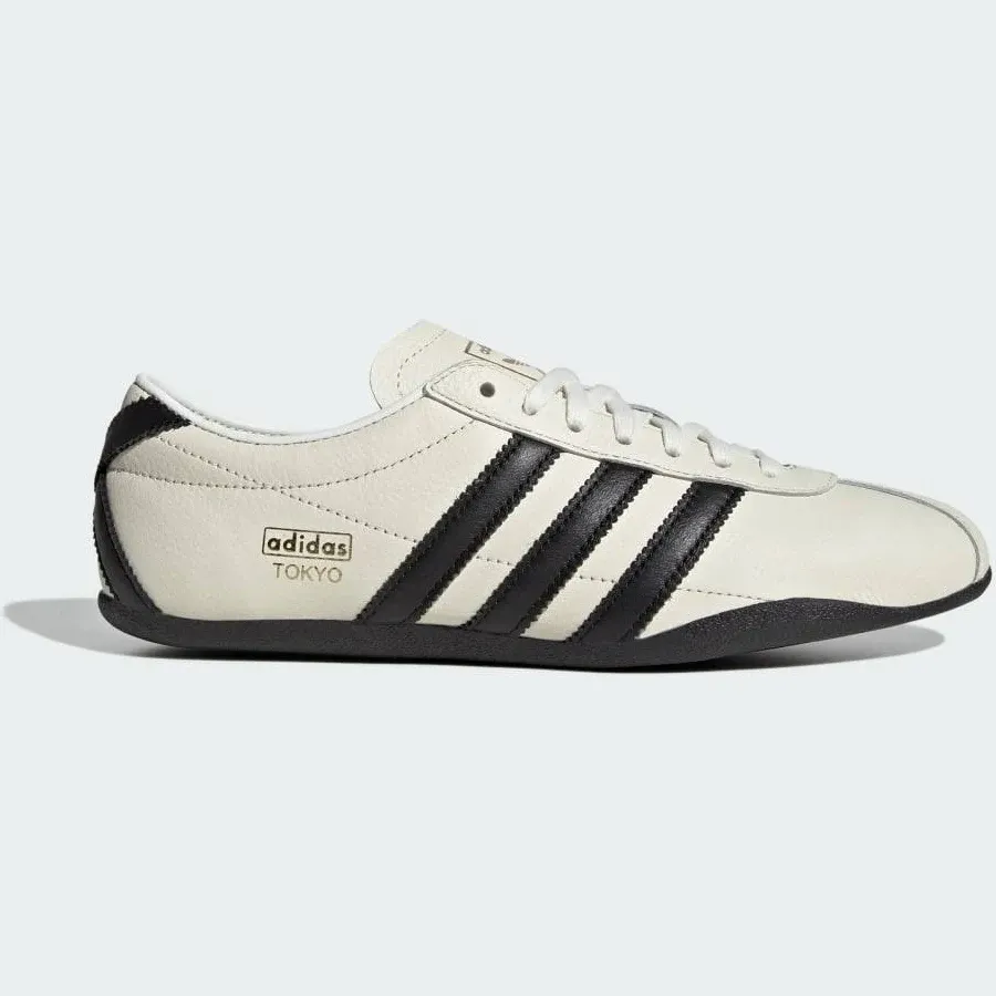 snippets: The adidas Originals Tokyo "Off White/Core Black/Gold Metallic" Women's Shoe blends ‘70s terrace inspiration with modern ease., A smooth leather-and-synthetic upper and low-profile silhouette channel vintage court vibes, while the refined color palette pairs effortlessly with everyday looks.