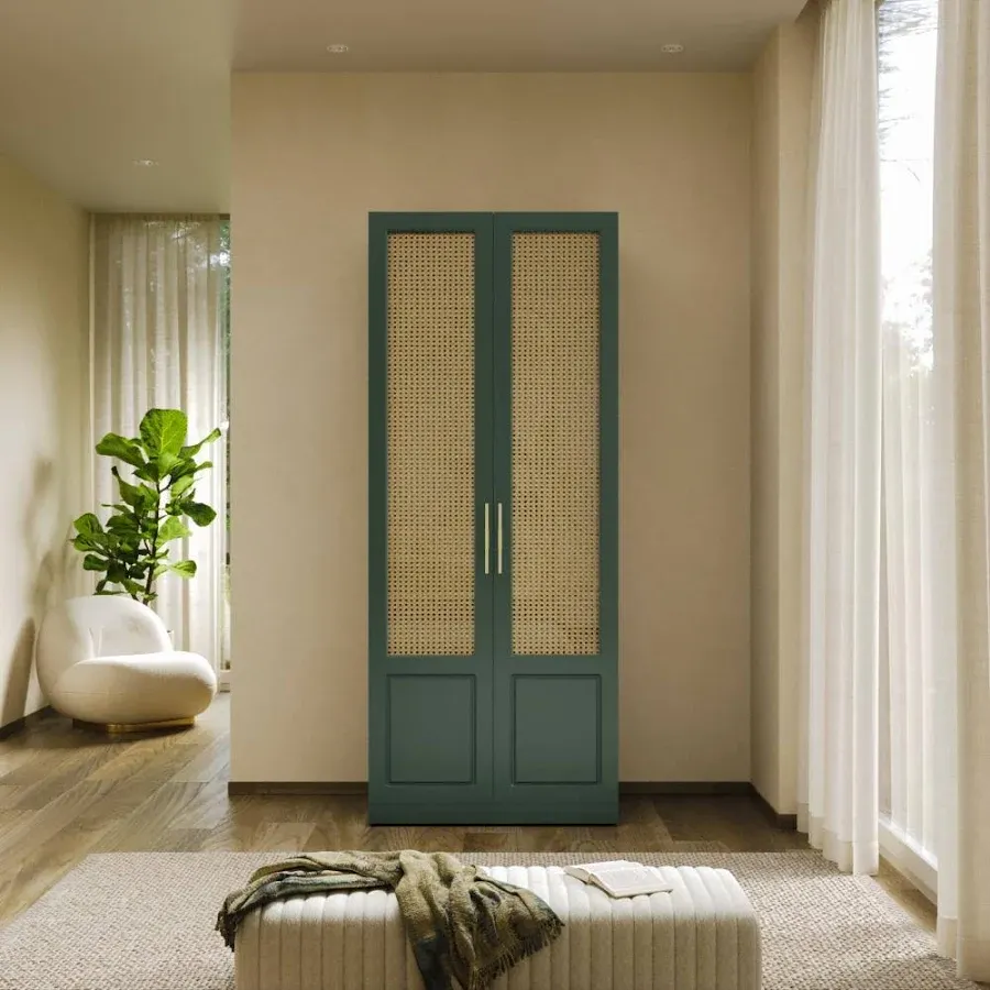 title: Wakefit Cersei 2 Door with 2 Shelves 1 Drawers 2 Rattan door - Carcass: Wood grain Honey Oak, Shutter: Forest Green (Foil) and Rattan