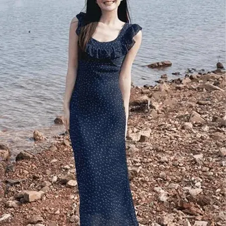 title: Savana navy ruffle bodycon dress (l), korean, elegant, summer, crew neck, sleeveless, sleeveless, none, ruffle, date