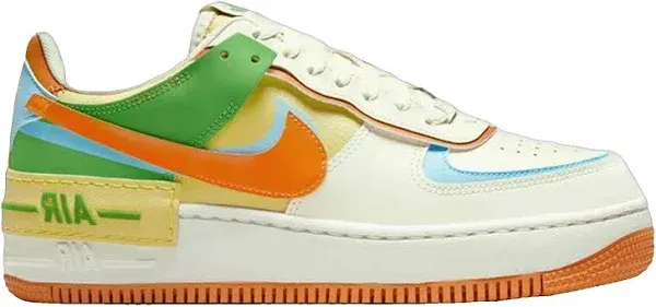 items 5: content: The Nike Air Force 1 Shadow 'Multi Color' DZ1847-103 is noted for its retro and playful vibe, with a multicolor finish that includes vibrant orange, yellow, blue, and green hues. This bold design flips the script on the classic Air Force 1, moving away from mundane aesthetics and offering a fresh, dynamic look.