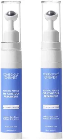 detailedReviews: detailedReviews 1: content: I’ve been using the Conscious Chemist Retinol Peptide Under Eye Cream with the soothing massage roller, and here’s what I noticed: it really helped in fading dark circles, reducing puffiness, softening wrinkles and fine lines, while also keeping my under-eye area deeply hydrated. I had a bit of redness and puffiness due to an allergy, but within 2–3 days it calmed down and showed visible improvement.