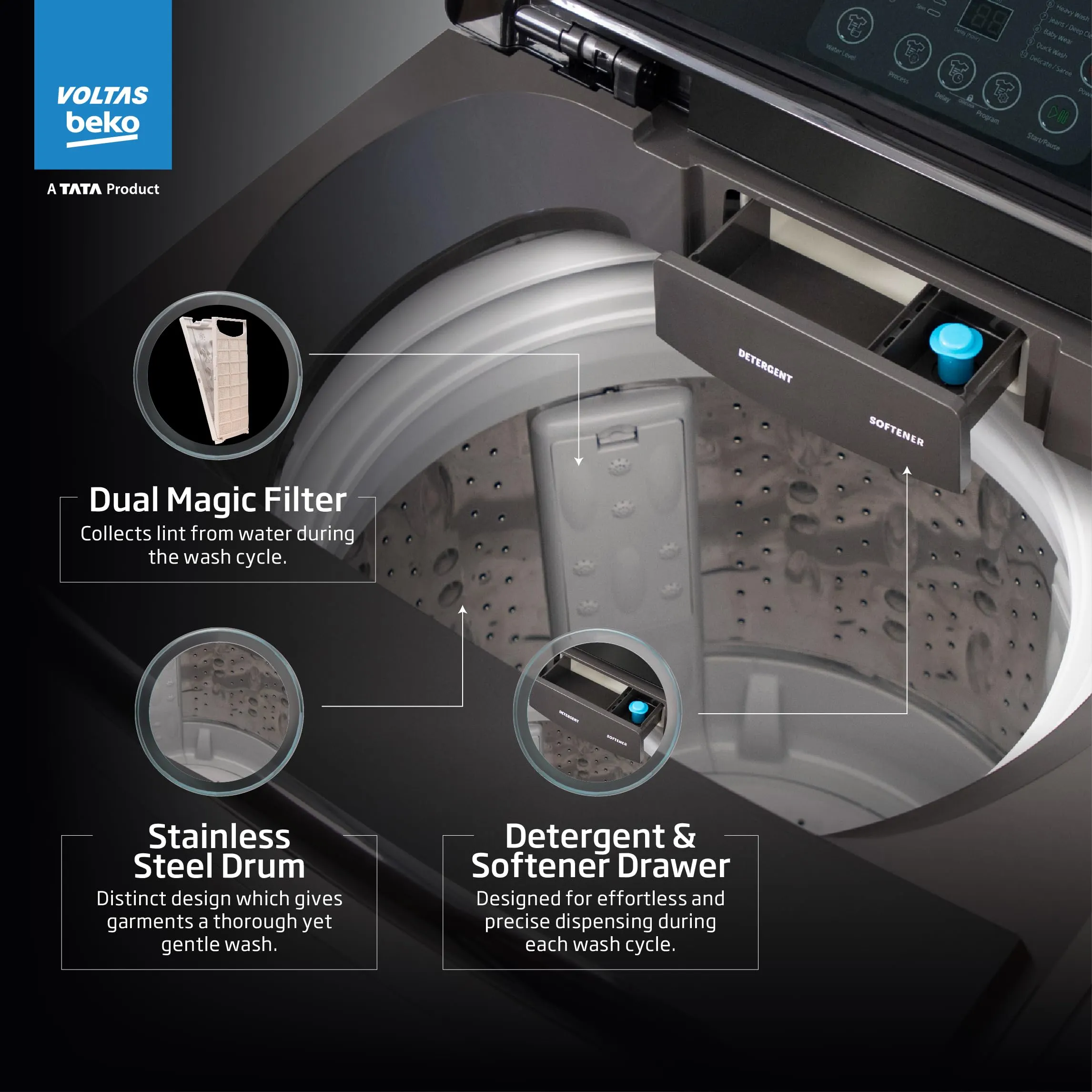 title: Voltas Beko 8 Kg, 5-Star, Fully Automatic Top Load Washing Machine (WTL8006UAA/SPC0OD, Grey) with 5 year comprehensive warranty and 12 year motor