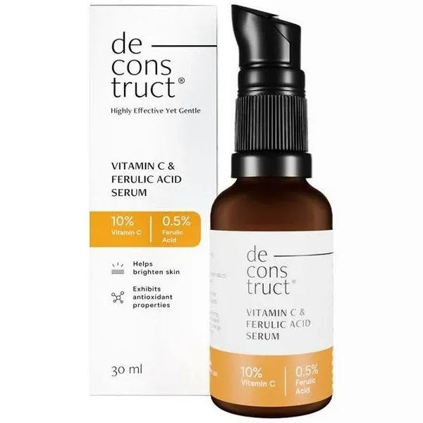 detailedReviews 35: content: The deconstruct Vitamin C & Ferulic Acid Serum is a standout skincare product! With a potent 10% Vitamin C and 0.5% Ferulic Acid blend it delivers a noticeable brightening effect and helps even out skin tone. The serum feels lightweight absorbs quickly and leaves the skin feeling hydrated and smooth. The sleek pump bottle ensures easy application and preserves the formula's potency. Perfect for daily use this serum is a great investment for a radiant healthy complexion!