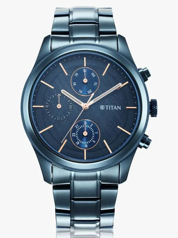 title: Titan Neo Splash Quartz Multifunction Midnight Blue Dial Metallic Blue Stainless Steel Strap Watch for Men - NT1805QM01
