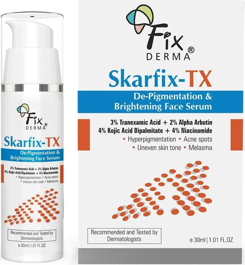 directLink: https://www.beautybumble.com/products/fixderma-skarfix-tx-face-serum-with-4-kojic-acid-4-niacinamide-serum-3-tranexamic-acid-2-alpha-arbutin-treats-hyper-pigmentation-melasma-reduce-acne-spots-brightening-the-skin-30ml?variant=47347443269864&country=IN¤cy=INR&utm_medium=product_sync&utm_source=google&utm_content=sag_organic&utm_campaign=sag_organic&srsltid=AfmBOopRM9-6TnoNAa0e7SUfMTr4LUXcUKs4W0C1nFUf86lrNrWTELi1Vjg