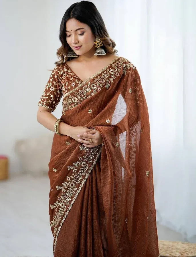 snippets: Saree Mall's sequinned pure chiffon sarees are available through various online platforms, including Myntra and Etsy.