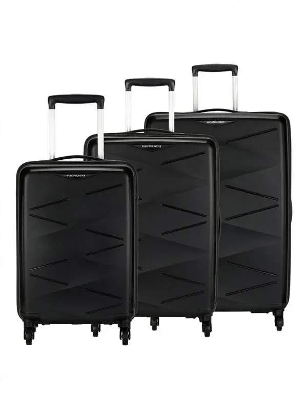 snippets: Comes with a combination lock, providing an added layer of security for your belongings., Outfitted with four smooth-rolling wheels, facilitating easy maneuvering during travel., Kamiliant by American Tourister Triprism Spinner 3pc Set Black Cabin & Check-in Luggage 30 inch