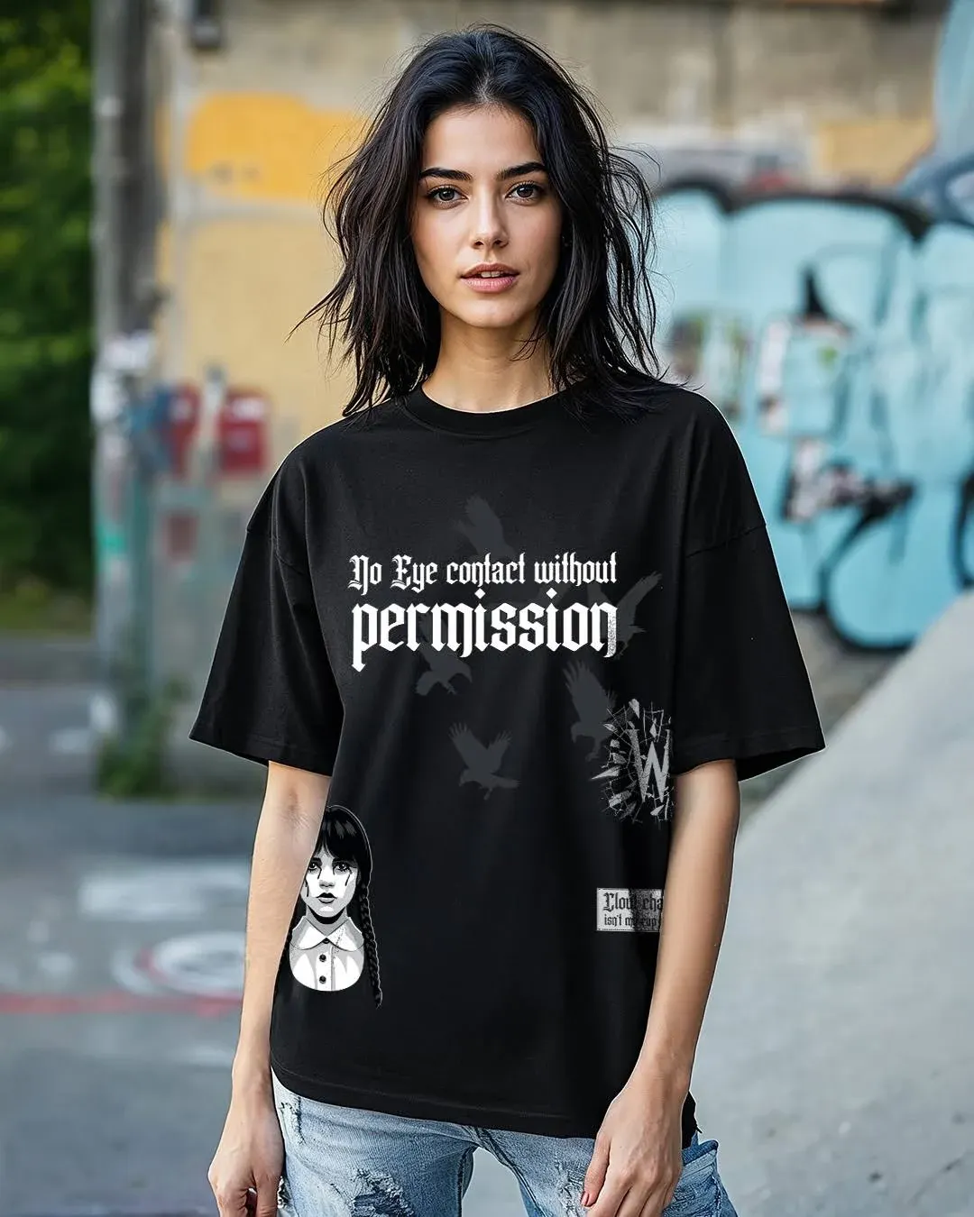 items 2: content: The 'Black Beauty Eye Contact Graphic' design adds a unique and eye-catching element to this t-shirt, appealing to those who want to express a bold or distinctive style. This graphic is a key feature that sets it apart from plain t-shirts.