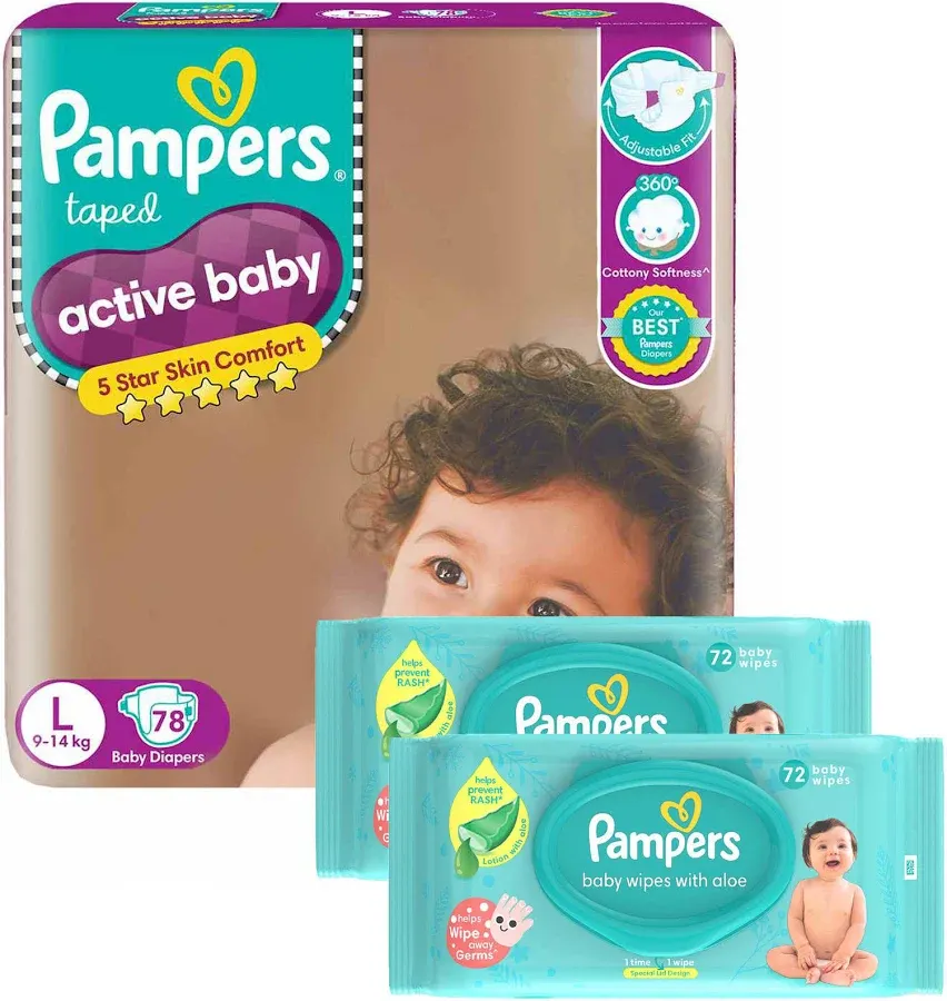 title: Pampers Active baby Tape Style Baby Diapers, Large (L), 78 Count, 9-14kg, Adjustable Fit with 5 Star Skin Protection Diapers