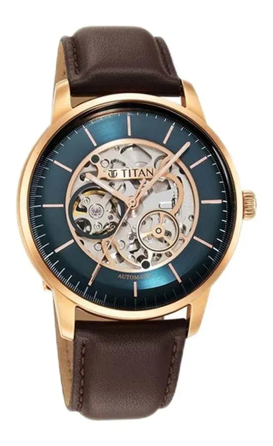 title: Titan Titan Automatic Teal Blue Dial Brown Leather Strap Analog Watch - For Men