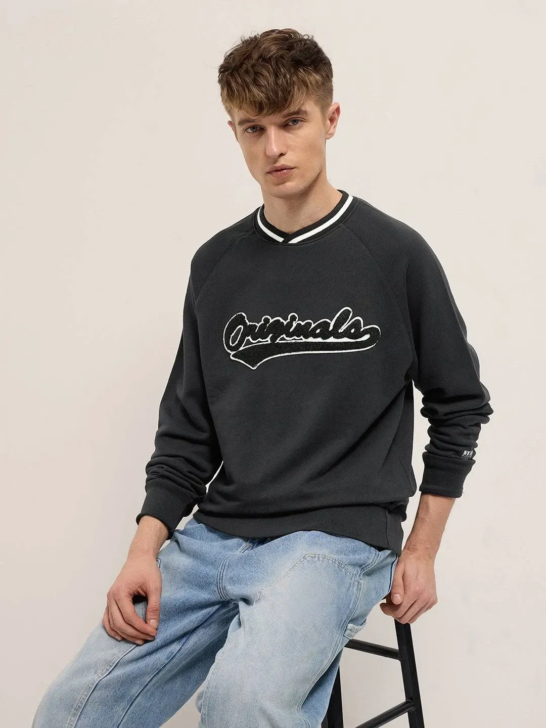 title: Men's Black Chenille Patch Design Relax Fit Crew Neck Sweatshirt