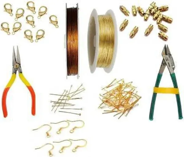 value: Gear Wire/Tiger Tail, Copper Wire, Golden Findings (Head Pin, Eye Pin, Jump Ring, Ear Hook), End Clasps(Barrel & Lobster) & Tools(Cutting & Bending) Combo for jewellery making,beading & other craft projects