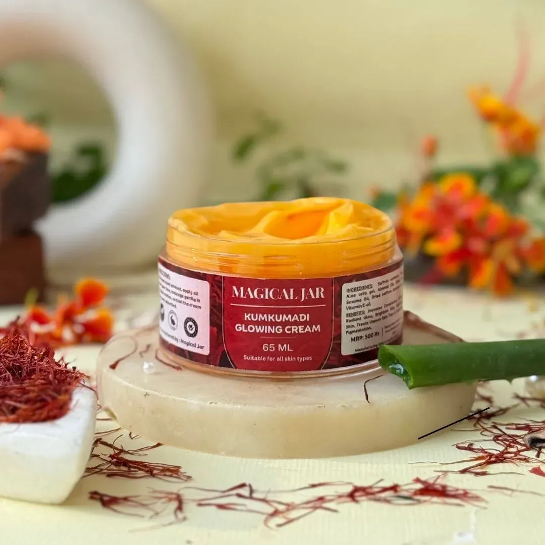 snippets: The Magical Jar Kumkumadi Glowing Cream is an Ayurvedic moisturizer infused with saffron and aloe vera, aiming to provide glowing skin and address issues like brightening and pigmentation., It's marketed for all skin types, but some users with dry skin reported dissatisfaction.