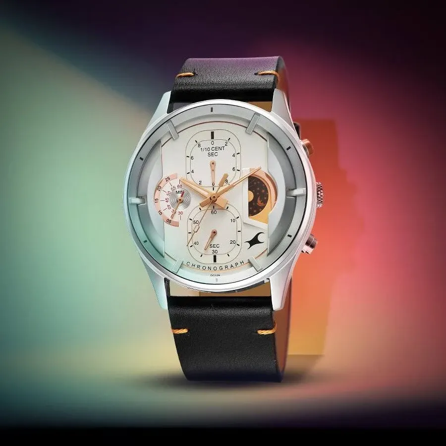 title: Fastrack Opulence Sun Moon Chronograph Silver Dial Black Leather Strap Analog Quartz Watch For Guys