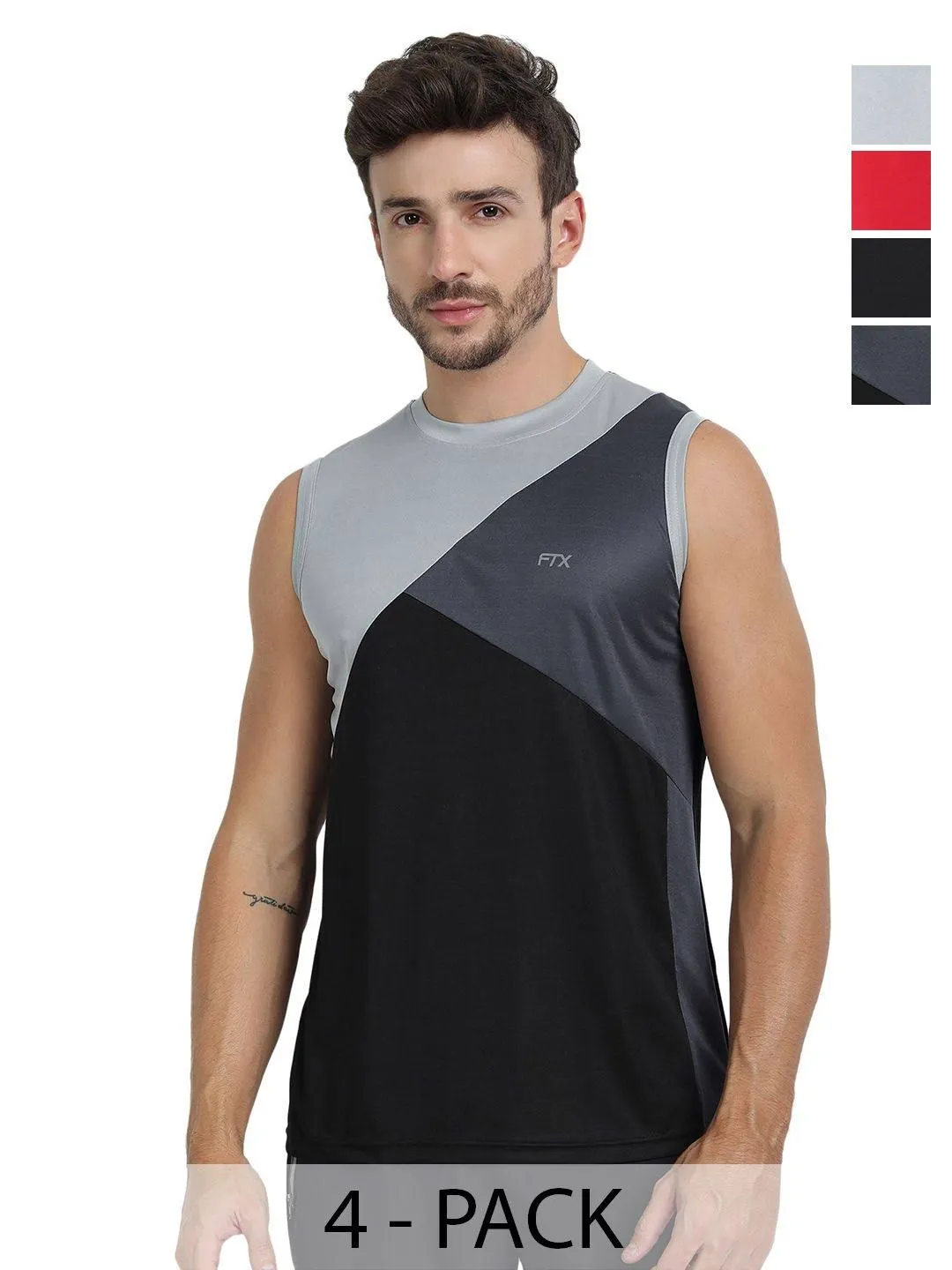 name: FTX Pack Of 4 Colourblocked Round Neck Sleeveless Dri-FIT Regular Fit Gym T-shirts(S) by Myntra