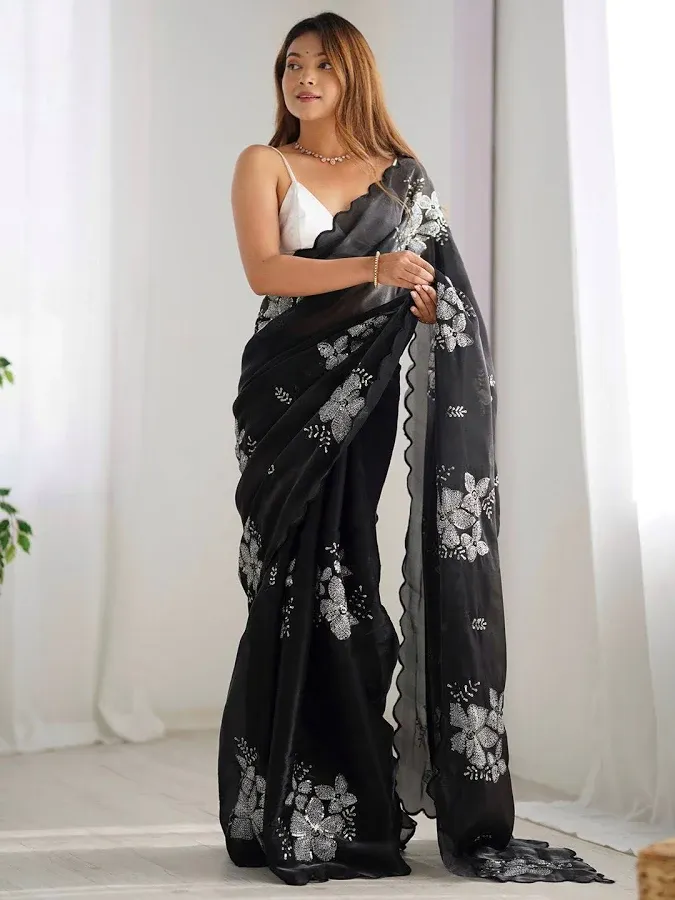 items: items 1: content: This organza saree offers a sophisticated and graceful appearance due to its light beige color and delicate floral embroidery, making it suitable for both casual and semi-formal events. The sheer fabric and scalloped border contribute to a refined look, while the flowy drape enhances its overall charm.