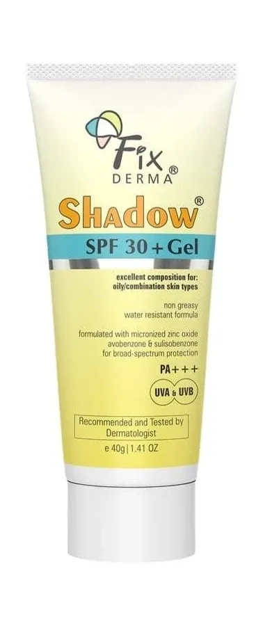 snippets: i think fix derma shadow spf 30 gel is the best sunscreen for oily to combination skin i have oily skin and it suits on my face it gently absorbs into my skin it gives smooth finish to my faceit also gives little bit shine on my face definitely good produ