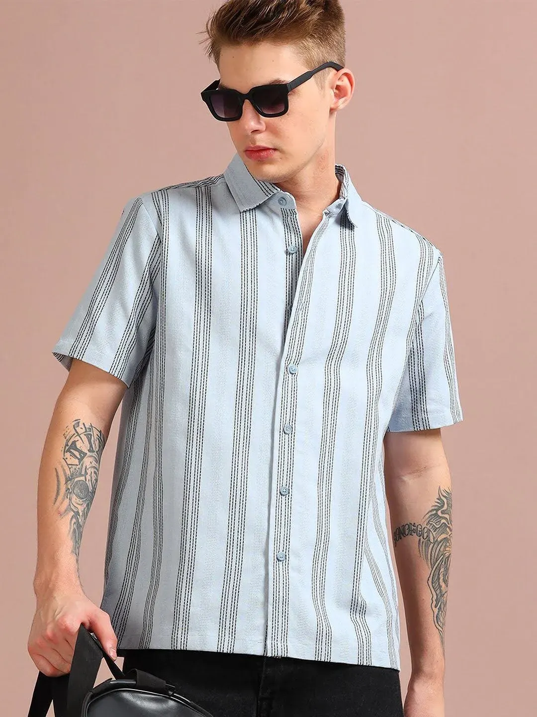 StitchX Men Half Sleeve Textured Striped Cutaway Collar Casual Shirt (49) by Myntra