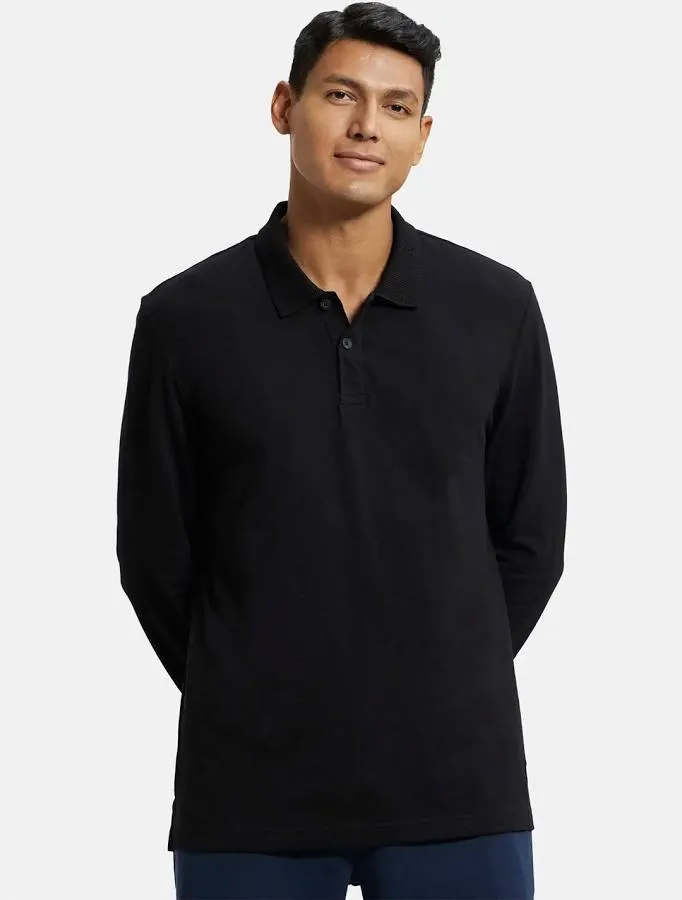 title: Buy Super Combed Cotton Rich Pique Fabric Solid Full Sleeve Polo T-Shirt with Ribbed Cuffs - Black AM96 | Jockey India M