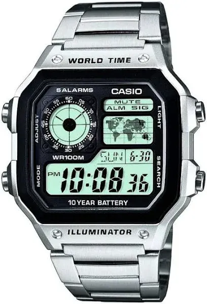 items 2: content: The Casio AE1200 nicknamed ?Casio Royale? is a fantastic blend of retro style and functionality. Its standout design with a world map display and bold rectangular face is eye-catching. Packed with features like world time multiple alarms a stopwatch and a 10-year battery life it offers exceptional value. The watch is lightweight comfortable and durable making it perfect for daily wear or travel. At its price it?s a must-have for anyone who loves versatile and stylish timepieces. Highly recommended!If you own one you are part of the history.